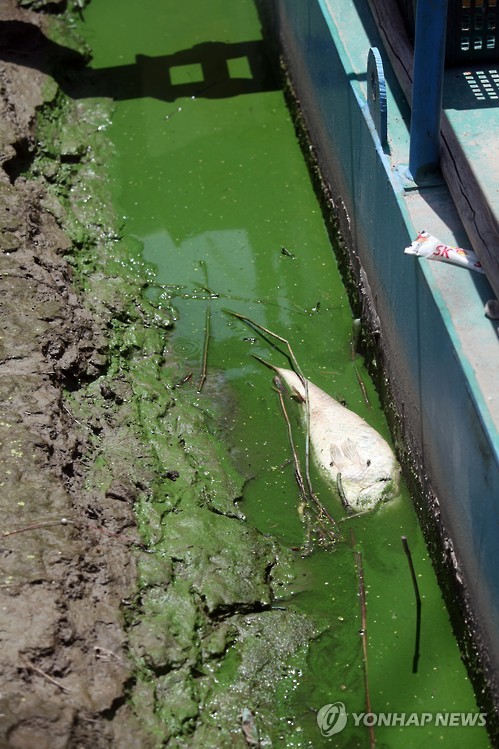 | △ 녹조로 폐사한 물고기 (고양=연합뉴스) 김승두 기자 = 서울환경운동연합은 29일 오전 경기도 고양시 행주대교 북단 행주나루터에서 기자회견을 열고 최근 한강 하류에서 발생한 녹조현상의 한 원인으로 신곡수중보를 지목하고 수중보 철거 등 대책 마련을 촉구하고 나섰다. 이날 행주나루터에는 짙은 녹색의 한강에 녹조로 폐사한 물고기들이 곳곳에 방치되어 있다. 2015.6.29 kimsdoo@yna.co.kr |