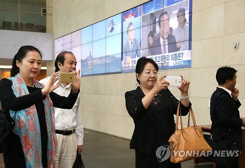 | △ 연합뉴스·TV 찾은 중국기자협회 대표단 (서울=연합뉴스) 이지은 기자 = 중국기자협회 대표단이 29일 오전 서울 종로구 연합뉴스 사옥을 방문해 휴대폰으로 사진을 찍고 있다. 중국기자협회 대표단은 한-중 기자협회가 언론교류 협력사업의 하나로 1993년부터 매년 운영하는 언론인 교류 프로그램에 따라 지난 27일 방한했다. |