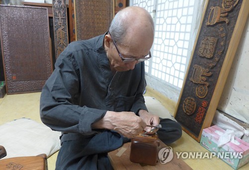 | △ 울산시 유형문화재 전각장 정민조씨 (울산=연합뉴스) 이상현 기자 = 최근 열린 울산시 문화재위원회에서 유형문화재로 지정된 전각장(篆刻匠) 정민조(71·울주군 서생면)씨. 2015.6.29 <<울산시>> leeyoo@yna.co.kr |