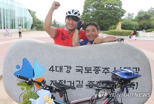 | △ 633㎞ 국토종주 성공한 발달장애인 (부산=연합뉴스) 차근호 기자 = 29일 오후 부산 낙동강 하구둑 국토종주자전거길 종점에서 인천 아라수문에서 출발해 이곳까지 오는 633㎞의 대정정을 성공한 발달장애인 류청우(23·사진왼쪽), 황동현(32·사진오른쪽)씨가 화이팅포즈를 취하고 있다. 2015.6.29 ready@yna.co.kr |