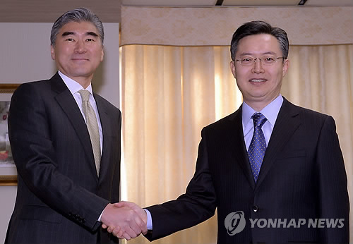 | △ 우리 측 6자회담 수석대표인 황준국 외교부 한반도평화교섭본부장(오른쪽)과 미국 측 수석대표인 성 김 미국 국무부 대북정책 특별대표 (연합뉴스 자료사진) |