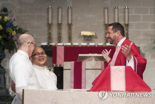| △ 미국 텍사스 주 댈러스의 한 성당의 사제가 28일(현지시간)동성커플의 결혼식을 주재하고 있다.(AP=연합뉴스) |