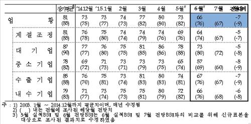 7월 업황 전망BSI도 67로 조사돼 5월에 조사했던 6월 전망치(76)보다 9포인트나 하락했다.