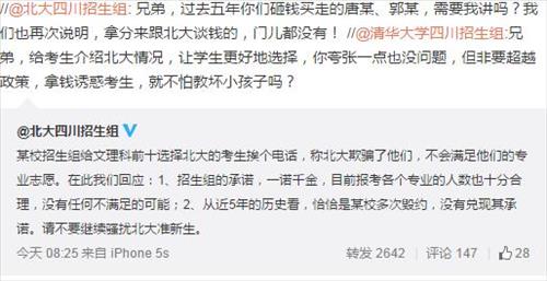 두 대학 신입생 유치조는 최근 쓰촨(四川)성에서 충돌했다. 웨이보(微博, 중국판 트위터), 웨이신(微信·위챗) 등을 통해 베이징대는 칭화대가 베이징대 지원 학생들에게 전화를 걸어 학교 험담을 하고 있다고 비난했고 칭화대는 베이징대가 학생들을 돈으로 유혹하고 있다고 비난했다.
