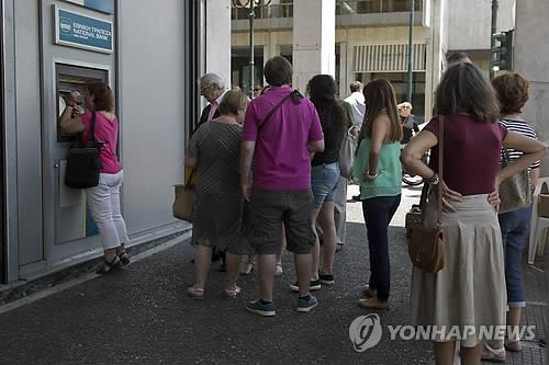 | △ (아테네 AP=연합뉴스) 그리스 정부의 은행 영업중단과 예금 인출제한 조치 속에 29일(현지시간) 아테네의 문닫힌, 내셔널 뱅크 지점 밖 현금자동입출금기(ATM) 앞에서 현금을 인출하려는 사람들이 줄지어 차례를 기다리고 있다. 은행영업 중단은 국민투표 시행일 다음날인 내달 6일까지 지속되지만 ATM을 통한 현금 인출은 이날 오후 재개됐다. 하루 인출 금액은 60유로(7만4천원)로 제한된다. bulls@yna.co.kr |