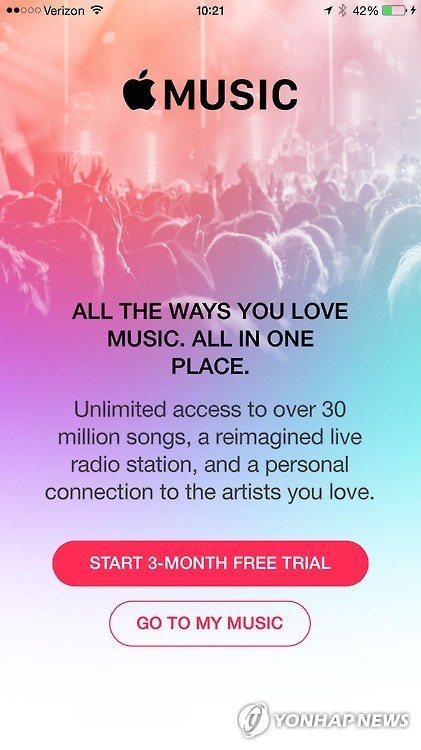 | △ '애플 뮤직' 스트리밍 서비스 (쿠퍼티노<미국 캘리포니아주>=연합뉴스) 임화섭 특파원 = 전 세계 시가총액 제1위 기업인 애플이 6월 30일 오전 8시(현지시간) 가입형 음악 스트리밍 서비스 '애플 뮤직'을 개시했다. 애플은 이날 아이폰·아이패드·아이팟용 운영체제의 최신 업그레이드 버전인 iOS 8.4를 무료로 배포하면서 이를 설치한 100여 개국 사용자들이 애플 뮤직에 가입해 이를 쓸 수 있도록 했다. solatido@yna.co.kr |