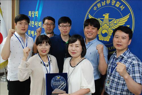 | △ 경기 수원남부경찰서 사이버범죄수사팀장 김지향 경위(앞줄 가운데)가 팀원들과 함께 포즈를 취하고 있다. |
