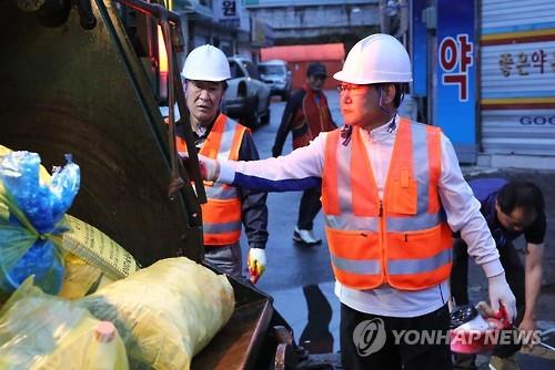 | △ 일일 환경미화원 변신한 박세복 영동군수. <<연합뉴스 DB>> |