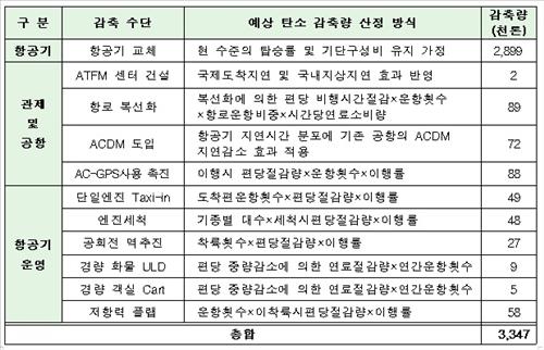 11개 감축법을 구체적으로 보면 연료효율이 좋고 탄소배출량이 적은 최신형 항공기 도입, 서울∼제주 구간 등 혼잡한 항공로를 복선화해 항공기 지연시간 축소, 계류장에 서 있는 항공기의 전력을 보조동력장치가 아닌 지상전원장치 연결 등이 있다.