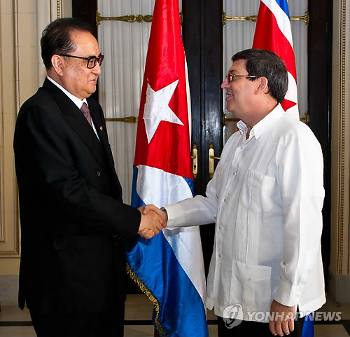 | △ 리수용 北외무상, 쿠바 방문 (AP=연합뉴스) 리수용 북한 외무상(왼쪽)이 16일(현지시간) 쿠바 아바나에서 브루노 로드리게스 쿠바 외무장관과 회담에 들어가기 전 악수를 나누고 있다. 리수용 외무상은 이날 회담에서 양국 관계를 폭넓게 강화하고 싶다는 김정은 북한 국방위원회 제1위원장의 메시지를 전달했다. marshal@yna.co.kr North Korea's Foreign Minister Ri Su Yong, left, shakes hands with Cuba's Foreign Minister Bruno Rodriguez during a photo opportunity before their meeting in Havana, Cuba, Monday, March 16, 2015. (AP Photo/Liu Bin, Pool) |