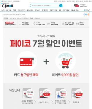 이 할인 혜택은 CJ몰의 신용카드 청구 할인과 함께 이용할 수 있다. 이벤트 기간에 KB국민카드, BC카드, 현대카드, 삼성카드[029780]를 페이코 간편결제 수단으로 등록하고 5만원 이상을 처음 결제하면 5천원 즉시 할인과 함께 5~10%의 청구할인 혜택까지 동시에 받을 수 있다.