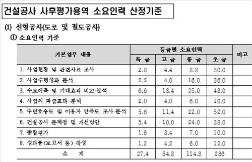 먼저 선형공사(도로·철도), 비선형공사Ⅰ(주택단지·산업단지공사), 비선형공사Ⅱ(공항·항만·댐·상하수도공사), 기타공사로 구분해 사업별 특성과 업무량에 따라 평가 수행에 필요한 인원수를 정했다.