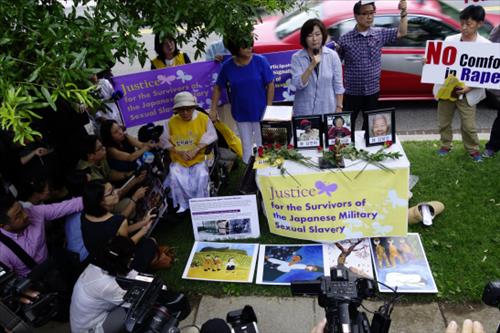 참석자들은 연설이 끝날 때마다 '우리는 정의를 원한다', '일본은 거짓말과 부정을 중단하고 진실을 말하라'는 내용의 영어 구호를 외쳤다.