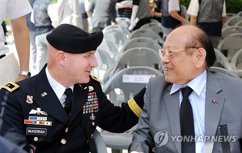 | △ "65년전 180명의 희생이 오늘날 번영에 밑거름" (오산=연합뉴스) 김경태 기자 = 2일 경기도 오산 유엔군초전기념비 앞에서 열린 제65주년 유엔군 초전기념 및 스미스부대 전몰장병 추도식에서 한국전쟁 당시 유엔군 첫 전투였던 오산 죽미령 전투에 한국군인으로 유일하게 참전했던 윤승국 예비역 소장(당시 대위)이 브라이언 맥키넌 미 8군 부사령관과 대화를 나누고 있다. 2015.7.2 ktkim@yna.co.kr |
