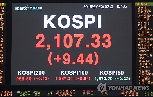 | △ 코스피, 9.44포인트 오른 2,107.33 마감 (서울=연합뉴스) 2일 오후 서울 여의도 한국거래소 전광판에 코스피 지수가 전 거래일 대비 9.44포인트(0.45%) 오른 2,107.33으로 표시되고 있다. (한국거래소 제공) |