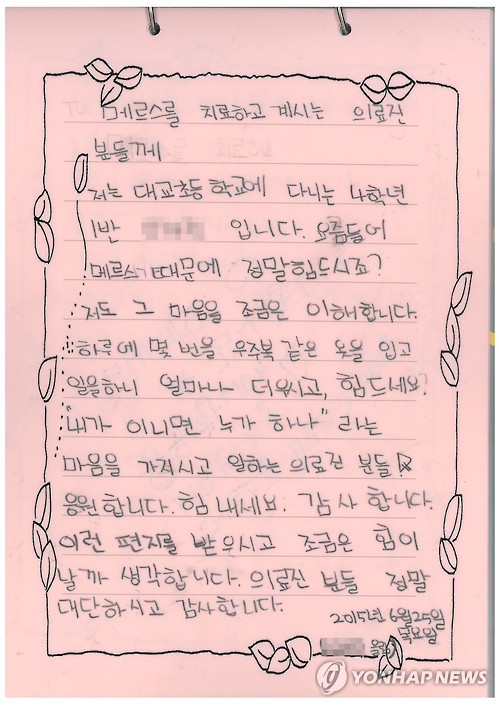 한 학생은 "요즘 들어 메르스 때문에 정말 힘들시죠? 저도 그 마음을 조금은 이해합니다…'내가 아니면 누가 하나'라는 마음을 가지고 일하는 의료진 분들 응원합니다"라고 썼다.