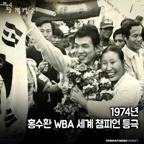 (서울=연합뉴스) 1974년 7월3일(한국시간 4일 새벽)은 한국 복싱의 전설 홍수환이 '챔피언을 먹은' 날이다. 남아프리카공화국 더반에서 열린 세계복싱협회(WBA) 밴텀급 타이틀전에서 남아공의 아널드 테일러(1945∼1981)를 누르고 챔피언 벨트를 허리에 둘렀다. 1966년 WBA 주니어 미들급 챔피언에 오른 김기수(1939∼1997)에 이어 한국 복싱 사상 두 번째 세계 챔피언 등극이자 첫 원정 타이틀 매치 승리였다.