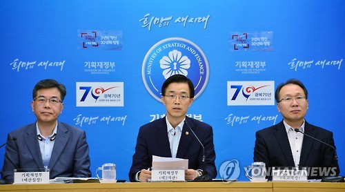 | △ 방문규 차관, 2015 추경예산안 사전브리핑 (서울=연합뉴스) 방문규 기획재정부 차관이 1일 정부세종청사 브리핑룸에서 2015 추경예산안 편성방향과 관련해 사전브리핑을 하고 있다. 왼쪽부터 송언석 예산실장, 방문규 2차관, 이원식 국고국장. |