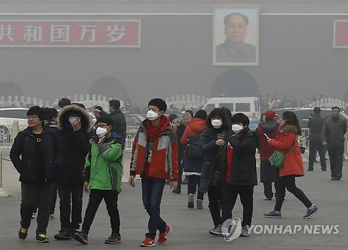 | △ 2014년 2월26일 중국 베이징에 스모그가 짙게 깔린 가운데 마스크를 한 주민들. 배경에 천안문이 흐릿하게 보인다.(EPA=연합뉴스 자료사진) |