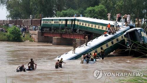 (뉴델리=연합뉴스) 나확진 특파원 = 파키스탄 동부 펀자브 주 구지란왈라에서 2일 오후(현지시간) 다리가 무너지면서 군용 열차가 운하로 추락, 최소 19명의 군인과 군인 가족이 사망했다고 현지 일간 돈(DAWN)이 3일 보도했다.