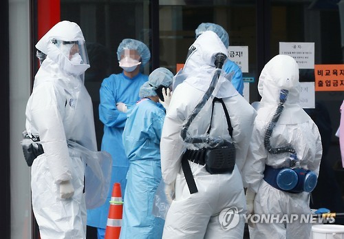 | △ 방호복 입은 병원 관계자들 (서울=연합뉴스) 박동주 기자 = 3일 오후 강남구 일원동 삼성서울병원 응급실 앞에서 방호복을 입은 병원관계자들이 대기하고 있다. 이날 삼성서울병원에서 중동호흡기증후군(메르스) 치료 중인 환자 15명 가운데 12명이 국립중앙의료원과 서울시 보라매병원 등으로 옮겨진다. 2015.7.3 pdj6635@yna.co.kr |