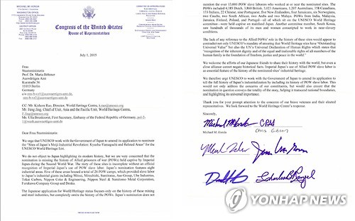 | △ 미 하원 연명서한 "전쟁포로 반영 안된 日세계유산 등재 반대" (워싱턴=연합뉴스) 심인성 특파원 = 유네스코 세계유산위원회(WHC)가 4일(현지시간) 일본의 산업혁명시설에 대한 세계유산 등록 여부를 결정할 예정인 가운데, 미국 연방 하원의원들이 공개적으로 반대하고 나섰다. 마이크 혼다(민주·캘리포니아) 의원을 비롯한 미 하원의원 6명은 3일 마리아 뵈머 세계유산위원회 의장 앞으로 연명 서한을 보내 "이번 등재 신청에는 2차 대전 당시 연합국 전쟁포로의 역사가 포함돼 있지 않다"며 반대 입장과 함께 세계유산위가 일본 정부에 등재 신청을 수정하도록 공식 요구해야 한다고 촉구했다. 연명 서한에는 혼다 의원 이외에 크리스 깁슨(공화·뉴욕), 마크 타카노(민주·캘리포니아), 짐 맥거번(민주·매사추세츠), 대럴 이사(공화·캘리포니아), 찰스 랭글(민주·뉴욕) 의원 등 민주, 공화 양당에서 초당적으로 참여했다. 사진은 연명 서한. 2015.7.4 seephoto@yna.co.kr |