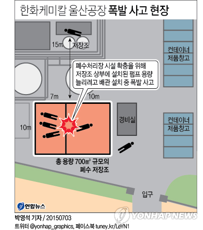 | △ <그래픽> 한화케미칼 울산공장 폭발 사고 현장 (서울=연합뉴스) 박영석 기자 = 3일 오전 9시 16분께 울산시 남구 여천동 한화케미칼 울산 2공장 폐수처리장 저장조에서 폭발 사고가 발생했다. 이 사고로 현장에서 작업하던 협력업체 현대환경 소속 근로자 6명이 숨지고 공장 경비원 최모(52)씨는 부상했다. 당시 현장에는 11명이 있었는데, 4명은 별다른 상처를 입지 않았다. zeroground@yna.co.kr |