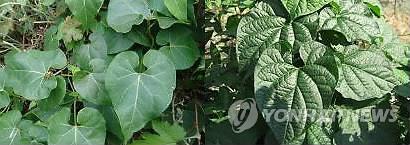 | △ (청주=연합뉴스) 백수오(왼쪽) 잎의 단면은 매끄럽고 이엽우피소(오른쪽) 잎은 거칠다. <<연합뉴스 DB>> |