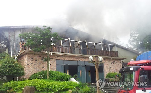 | △ (제주=연합뉴스) 5일 오전 제주시 애월읍에 있는 샌드위치패널 구조의 모 교회 기도원 2층에서 불이나 119 소방당국이 진화하고 있다. 이 불로 2명이 중상을 입었다. 2015.07.05. <<제주도 소방안전본부>> koss@yna.co.kr |