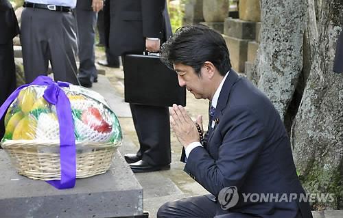 | △ (야마구치현 교도=연합뉴스.자료사진) 아베 신조(安倍晋三) 일본 총리가 2013년 8월 13일 메이지 유신의 정신적 스승이자 제국주의 침략의 이론가였던 요시다 쇼인(吉田松陰·1830∼1859)을 기리는 '쇼인신사'에서 합장한 채 참배하는 모습. |