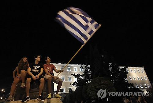 | △ 신타고그 광장에 나부끼는 그리스 국기 (아테네 EPA=연합뉴스) 채권단 제안에 대한 그리스 국민의 찬반을 묻는 투표가 치러진 5일(현지시간) 반대가 압도적이라는 결과가 나오자 아테네 신타고그 광장에서 반대 지지자들이 국기를 흔들고 있다. 2010596@yna.co.kr epa04832875 Supporters of the 'No' campaign wave flags and react after the first results of the referendum at Syntagma Square, in Athens, Greece, 05 July 2015. Greek voters in the referendum were asked whether the country should accept reform proposals made by its creditors. EPA/YANNIS KOLESIDIS |