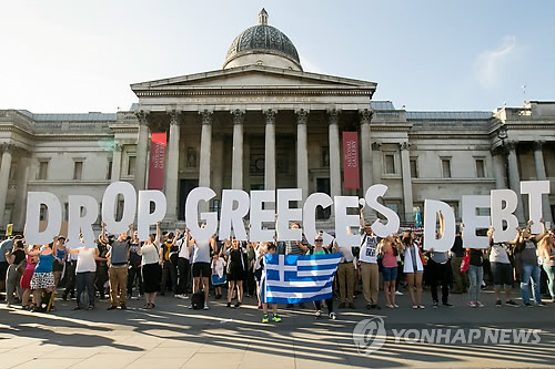 | △ '그리스 부채를 탕감하라' (런던 AP=연합뉴스) 그리스와 국제채권단의 협상결렬로 그리스의 디폴트(채무불이행) 위기가 고조되는 가운데 유럽중앙은행(ECB)의 구제금융상환 정책에 반대하는 사람들이 29일(현지시간) 영국 런던 트라팔가 광장에서 '그리스 부채를 탕감하라'(DROP GREECE'S DEBT)는 문구를 들고 시위를 벌이고 있다. marshal@yna.co.kr Demonstrators holding letters to form a banner take part in a protest against the European Central Bank, in Trafalgar Square, London, over Greece's debt repayments, Monday June 29, 2015. Standard & Poor's rating agency has cut Greece's credit grade by one notch further into junk status amid the country's deteriorating financial situation. The agency says it now sees a 50-percent chance of Greece leaving the eurozone. (Daniel Leal-Olivas/PA via AP) UNITED KINGDOM OUT NO SALES NO ARCHIVE |