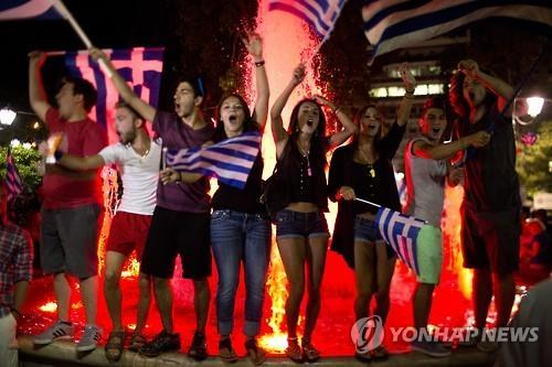 밤새 그리스 국기 휘날려…'그리스인 조르바' 음악 맞춰 춤추며 자축
