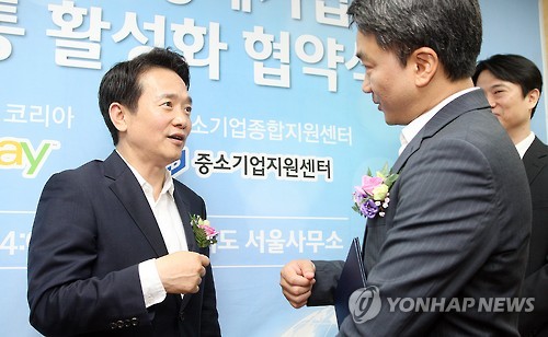 | △ 경기도·이베이코리아, 온라인유통 협약 (수원=연합뉴스) 6일 오후 경기도 서울사무소에서 열린 '경기도 사회적경제기업 온라인 유통 활성화 협약식'에서 남경필 경기도지사(왼쪽)가 변광윤 이베이코리아 대표와 이야기를 나누고 있다. 2015.7.6 <<경기도 제공>> hedgehog@yna.co.kr |