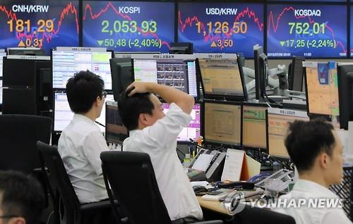 이날 코스피 지수는 전 거래일보다 2.40% 하락한 2,053.93에 거래를 마쳤다. 하루 낙폭으로는 올해 들어 최대 수준이다. 서울 외환시장에서 원/달러 환율은 3.50원 오른 1,126.50원에 마감했다.