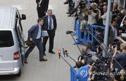 | △ 7일 브뤼셀에서 열린 유로그룹 회의장에 도착하는 차칼로토스 그리스 재무장관(EPA=연합뉴스) |