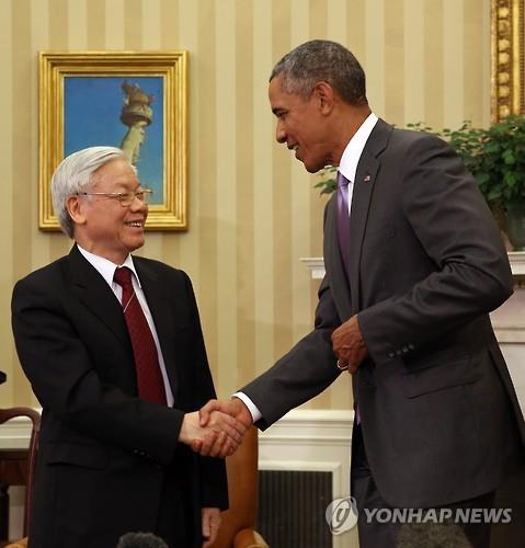 (워싱턴=연합뉴스) 노효동 특파원 = 미국과 베트남사회주의공화국(약칭 베트남) 간의 수교 20주년을 앞두고, 버락 오바마 미국 대통령과 베트남의 응웬 푸 쫑(71) 공산당 서기장이 7일(현지시간) 미국 백악관에서 회동했다.