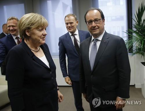 | △ 7일(현지시간) 브뤼셀에서 열린 유로존 정상회의에 참석한 메르켈 총리와 올랑드 대통령.(AP=연합뉴스) |