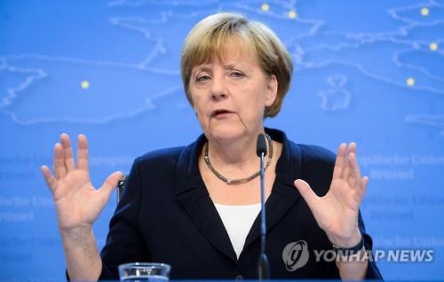 | △ 메르켈 총리가 7일 유로존 정상회의를 마친후 기자회견을 하고 있다.(EPA=연합뉴스) |