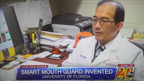 | △ '이갈이'를 하는지를 탐지해 의사에게 알려주는 웨어러블 기기인 '스마트 마우스 가드'를 개발한 미국 플로리다대 전기컴퓨터공학과의 윤용규 부교수. 사진은 미국 지역방송인 'WCJB-TV'에 출연한 화면을 캡처한 것임. |