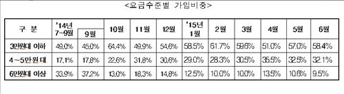 반면 3만원대 이하 저가 요금제 가입 비중은 작년 7∼9월의 49.0%에서 단통법 발효 이후 57.2%로 8%포인트 이상 증가했고, 4만∼5만원대 중간 요금대 가입 비중은 단통법 이전 17.1%에서 30.3%로 13%포인트 이상 늘어났다.