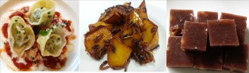 | △ 왼쪽부터 고소애를 활용한 리코타치즈 라비올리, 고구마 맛탕, 양갱.<<농촌진흥청 제공>> |