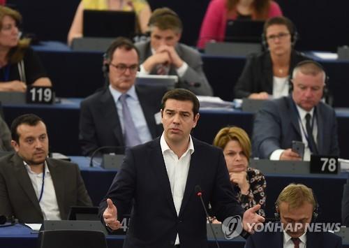 | △ 치프라스 그리스 총리가 8일 유럽의회에서 발언하고 있다.(EPA=연합뉴스) |
