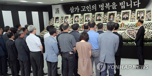 | △ "삼가 고인의 명복을 빕니다" (완주=연합뉴스) 김동철 기자 = 중국 연수 중 버스 추락사고를 당해 귀국한 공무원들이 9일 오전 전북 완주군 지방행정연수원에 복귀한 뒤 분향소를 찾아 고인들의 넋을 위로하고 있다. 2015.7.9 sollenso@yna.co.kr |