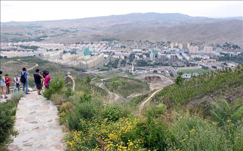 | △ (아러타이=연합뉴스) 권수현 기자 = 중국 신장위구르자치구 아러타이(阿勒泰)시 장쥔산(將軍山) 일대에 진행중인 녹화사업 현장 모습. 새로 심긴 나무 묘목과 수풀 너머로 아러타이 신시가지(좌)와 구시가지(우), 그 너머 아직 황무지 상태인 구릉지가 보인다. 2015.6.28 inishmore@yna.co.kr |