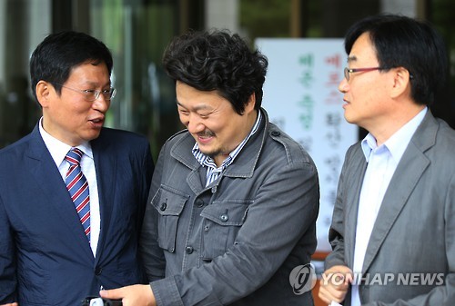 | △ 밝은 표정의 이상호 (서울=연합뉴스) 김도훈 기자 = 이상호 전 MBC 기자(가운데)가 9일 오전 서울 서초구 대법원에서 열린 해고무효 소송 상고심 선고공판을 마친 뒤 김환균 언론노조 위원장(왼쪽)과 조능희 언론노조 MBC 본부위원장으로부터 축하를 받고 있다. 이날 대법원은 "해고는 무효이며 2013년 1월부터 복직 때까지 월 400만원을 지급하라"고 판결한 원심을 확정했다. |