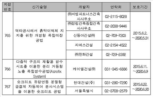 신기술 제765호로 지정된 개방형 흙막이 공법(역타공사에서 흙막이벽체 지지를 위한 개방형 복합띠장공법)은 지하구조물을 공사할 때 지상과 가까운 부분부터 시공하는 '탑다운공법'에 적용되는 기술로 작업공간 확보가 쉽고 건축물의 벽체를 한 번에 공사할 수 있어 누수 발생 등을 해결한 기술이다.