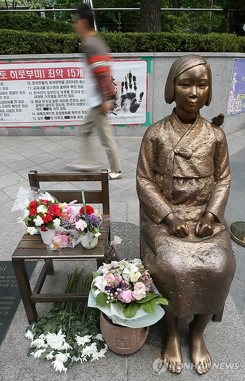 | △ 소녀상과 카네이션 (서울=연합뉴스) 한종찬 기자 = 6일 오후 서울 종로구 주한일본대사관 앞에 설치된 소녀상 옆에 카네이션이 놓여있다. 2015.5.6 saba@yna.co.kr |