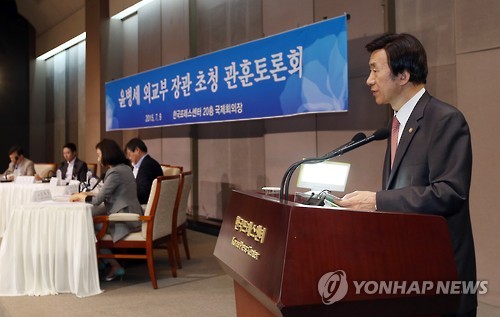 | △ 윤병세 외교장관 초청 관훈토론회 (서울=연합뉴스) 신준희 기자 = 윤병세 외교장관이 9일 오전 서울 중구 프레스센터에서 열린 외교장관 초청 관훈토론회에서 모두발언을 하고 있다. |