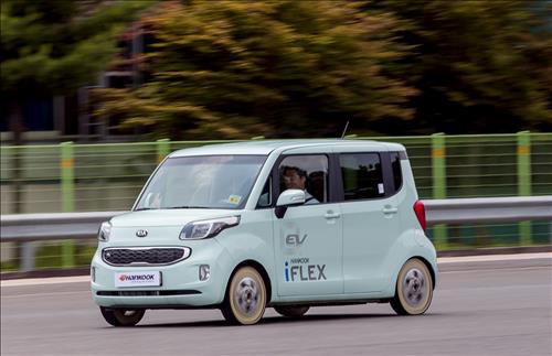 한국타이어는 친환경 소재로 만든 비공기입 타이어(NPT) '한국 아이플렉스'를 개발해 실제 차 주행 시험을 성공적으로 마쳤다고 9일 밝혔다.